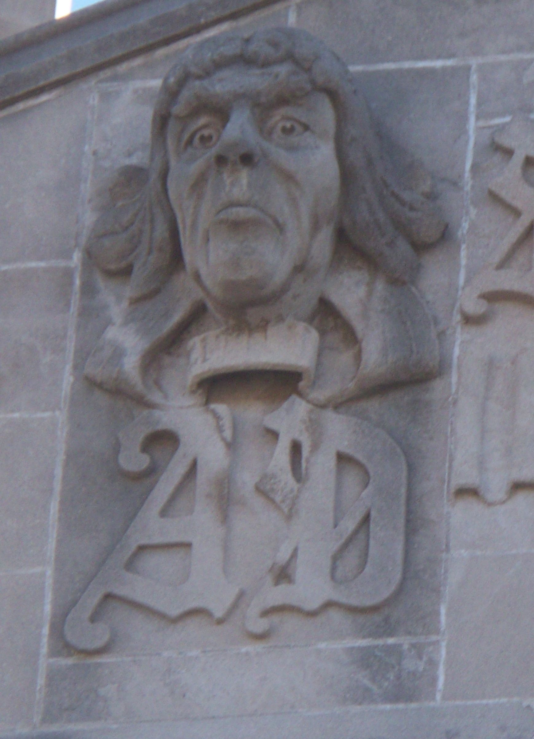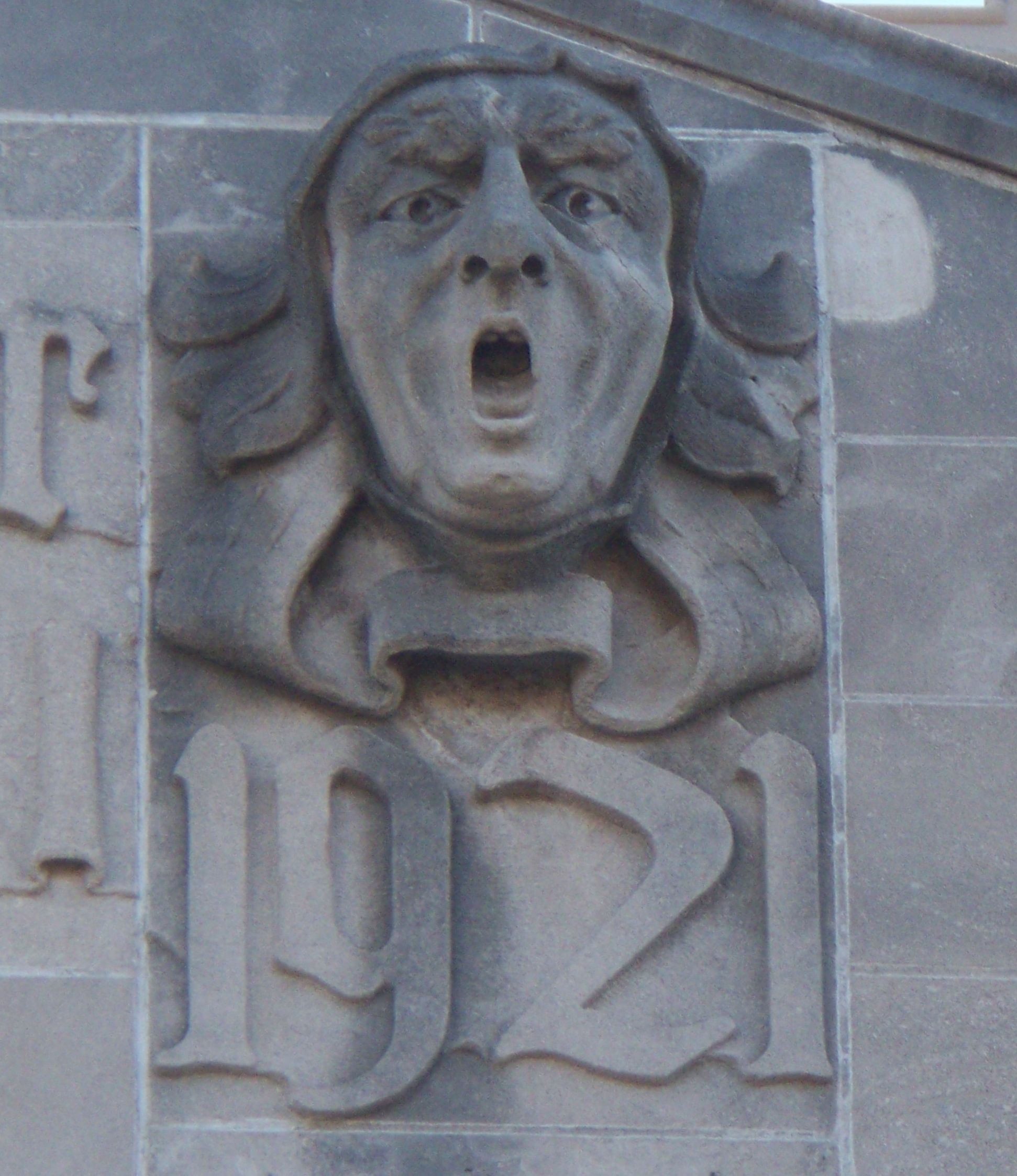 These figures from the front of DUBUQUE SENIOR HIGH SCHOOL could be considered gargoyles under the modern definition.