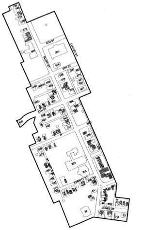 The most notable terrace projection is one that expands from the base of the West Third Street hill. This elevation contrasts markedly with the lower grade Cathedral Block. To the southeast the ground falls away gradually. A second marked terrace is the site of the present day Central School. The ground drops abruptly along the back lots along Emmett Street.