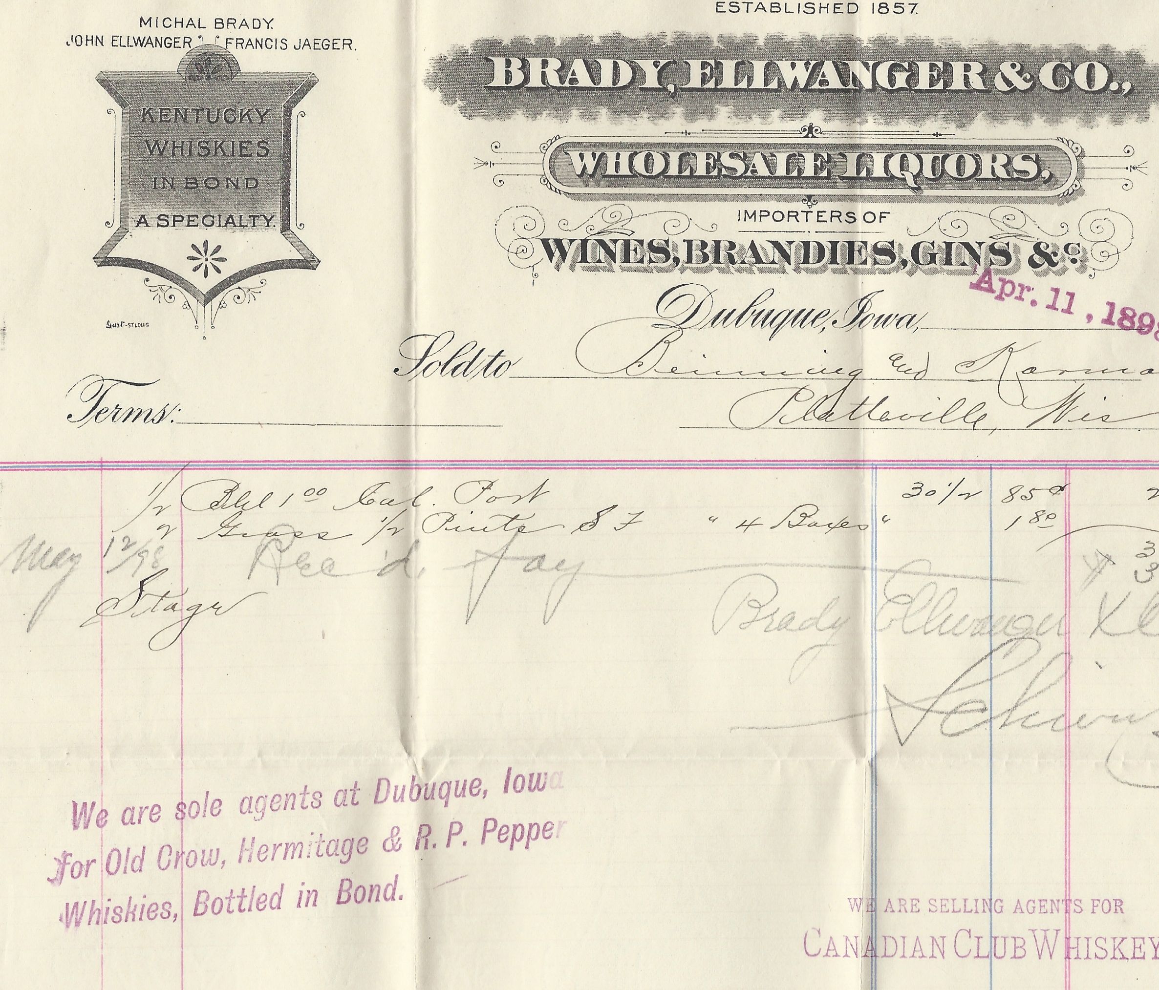 BRADY, ELLWANGER & CO. In June, 1875 Michael Brady with his business partner John Peter ELLWANGER purchased two thirds of Francis Jaeger's wholesale liquor business. The new firm, Brady, Ellwanger & Company, was located at 422 Main according to the Dubuque City Directory. (1)