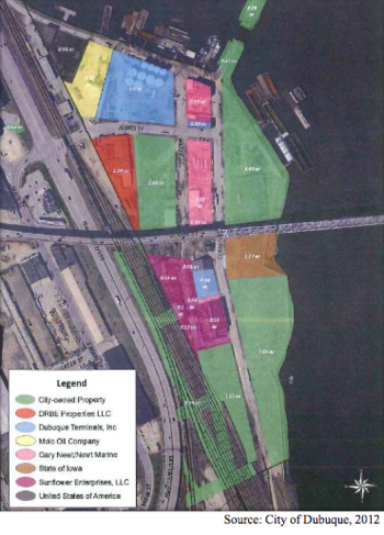 In 2016 property owners in South Port included the City of Dubuque with one-third of the total acreage, DRBE Properties, Dubuque Terminals, Molo Oil Company, NEWT MARINE SERVICE, the state of Iowa, Sunflower Enterprises, a railroad, and the United States Coast Guard. (18)