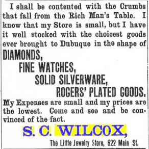 He moved to Dubuque in 1878 and began business for himself in January 1880. Wilcox gave special attention to repairing fine watches and fine engraving.