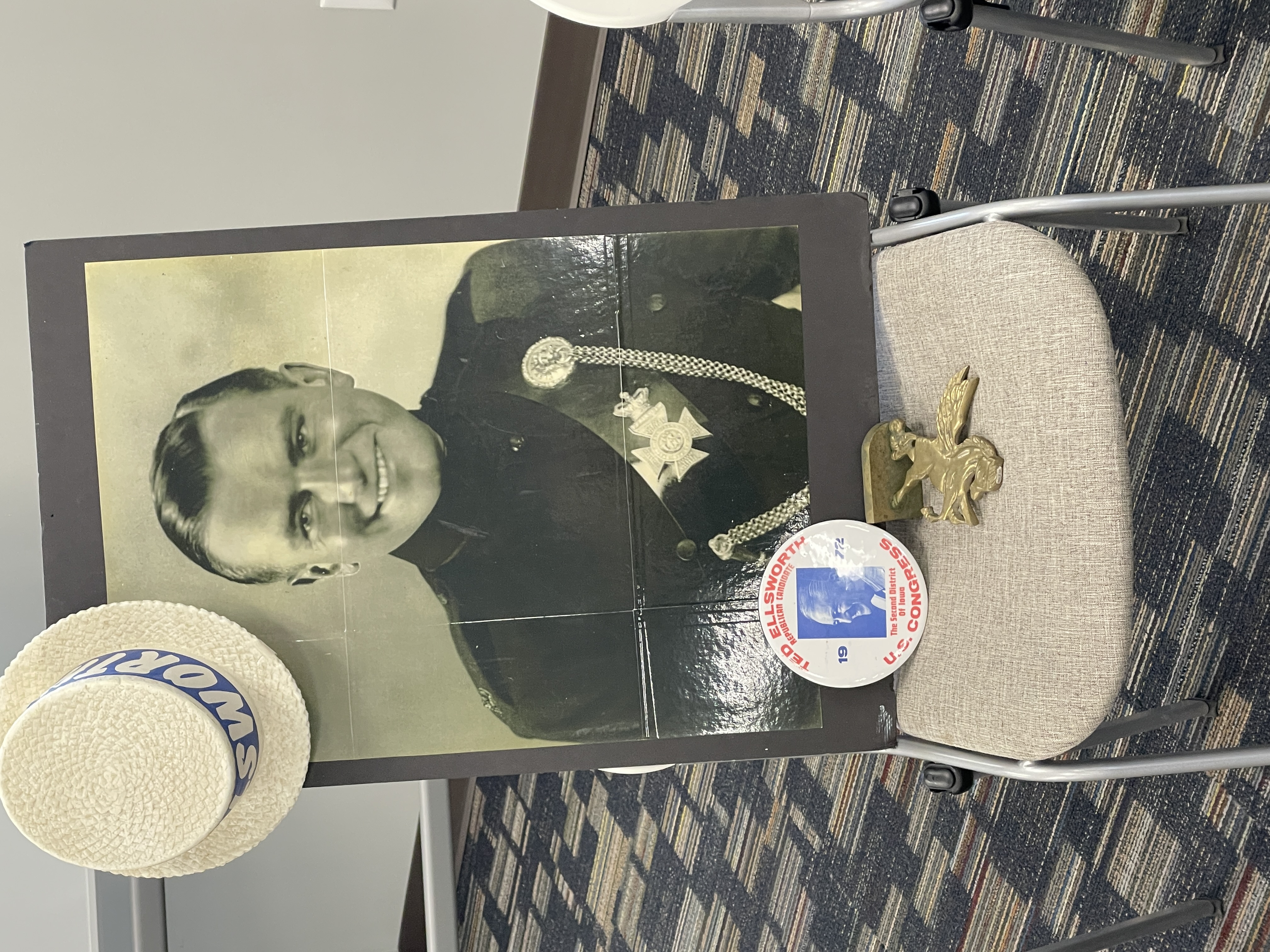 [[Image:ellsworth2. | [[Image:ellsworth2.JPG|right|thumb|250px|Ellsworth wearing a medal presented for his role in the King's Royal Rifle Corps under Field Marshall Montgomery in World War II prior to his joining American troops under General Patton.]]In 1942 during [[WORLD WAR II]], Ellsworth was one of two young men accepted by the United States Army for liaison work. After attending school, they were commissioned infantry officers. (1) He served as an officer in the King's Royal Rifle Corps of the British Army before transferring to the American Third Army. Captured, Ellsworth was liberated by Russian troops. (2) He finished the war as the highest decorated combat soldier in Dubuque history since the [[CIVIL WAR]]. His experiences became the basis of his book '''Yank: Memoir of a World War II Soldier (1941-1945)-From the Desert War of North Africa to the Allied Invasion of Europe'''. He received the Distinguished Service Cross. | ||