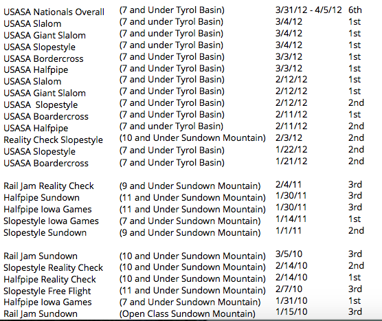 In 2013 Korey won the Midwest Regional Championship. He also competed in the slope style and super pipe events at the United States of America Snowboarding Association National Championships in Copper Mountain, Colorado for the second year in a row. | |||