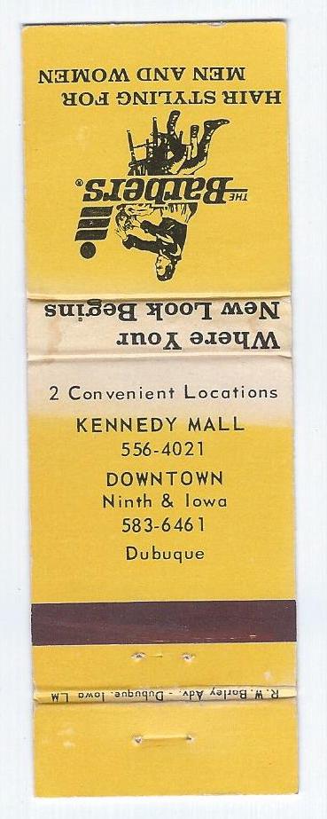 BARBERS (THE). The 1977 ''Dubuque City Directory'' listed 555 John F. Kennedy Road. | [[Image:av20.jpg|left|thumb|250px|Matchbook. Photo courtesy: Mike Avittt]]BARBERS (THE). The 1977 '''Dubuque City Directory''' listed 555 John F. Kennedy Road. | ||