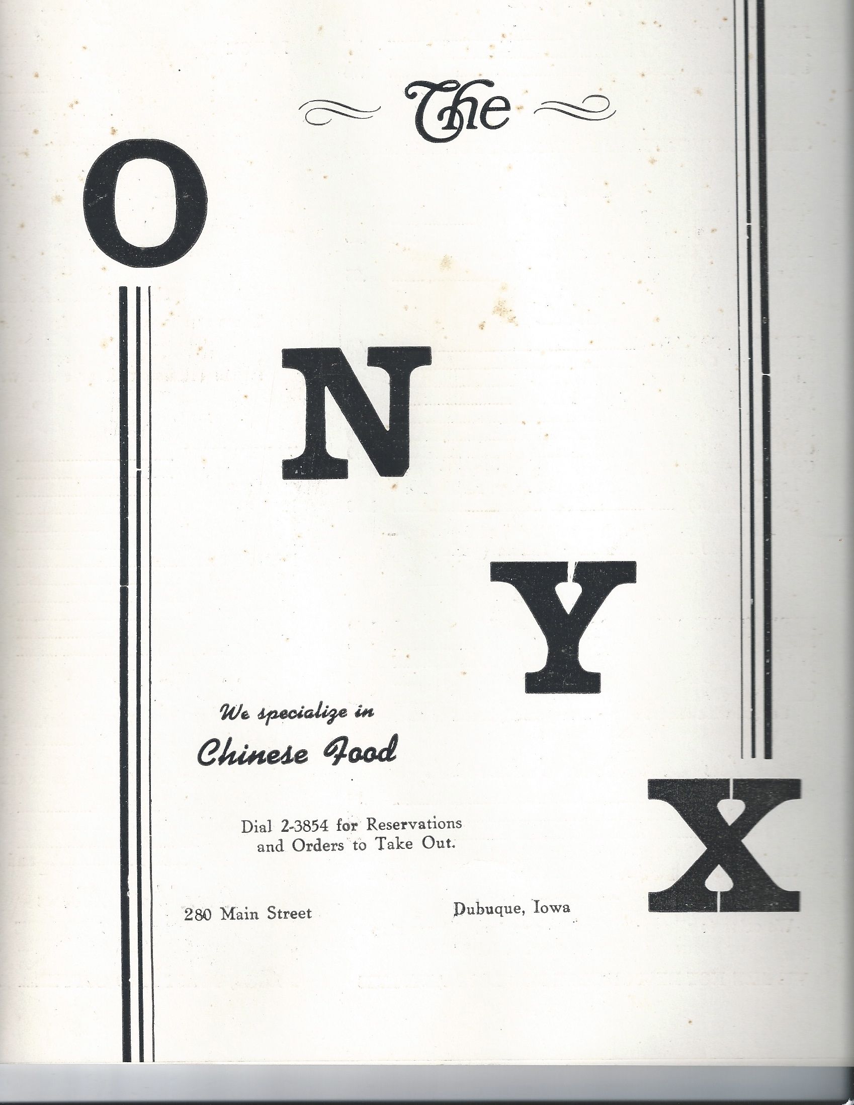 ONYX RESTAURANT (THE). The 1962 through 1966 ''Dubuque City Directory'' listed 280 Main. | [[File:onyx.jpg|250px|thumb|left|Photo courtesy: Bob Reding]] ONYX RESTAURANT (THE). The 1962 through 1966 ''Dubuque City Directory'' listed 280 Main. | ||