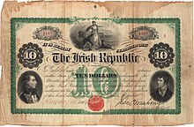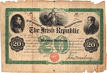 [[File:twentydollar.jpg|300px|thumb|left|Twenty dollar bond]]In the United States two Fenian factions raised money by the issue of bonds in the name of the "Irish Republic," which were bought by the faithful in the expectation of their being honored when Ireland should be "A Nation Once Again". These bonds were to be redeemed "six months after the recognition of the independence of Ireland." Hundreds of thousands of Irish immigrants subscribed.