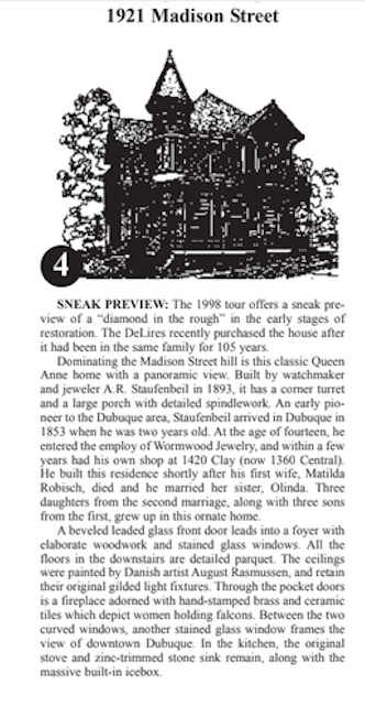 [[Image:staufenbeil6.jpg|left|thumb|250px|]]AUGUST R. STAUFENBEIL. The 1880 through 1886-1887 ''Dubuque City Directory'' stated that this business was located at 1420 Clay. | [[Image:staufenbeilt.png|left|thumb|350px| 1921 Madison. Photo courtesy: Old House Enthusiasts' Club House Tour, 1998]] | ||