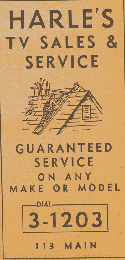 [[Image: | [[Image:harles1.jpg|left|thumb|250px|1955 advertisement. Photo courtesy: Bob Reding]]HARLE'S TV SALES & SERVICE. The 1955 ''Dubuque City Directory'' listed 113 Main. | ||