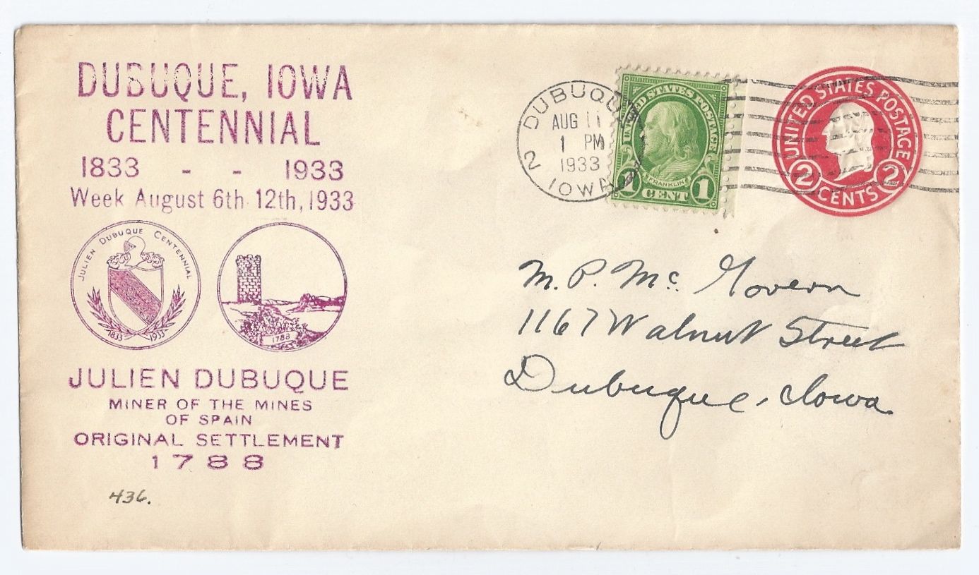 JULIEN DUBUQUE CENTENNIAL. The Julien Dubuque Centennial was held from August 6-12, 1933. In the week's long celebration, a play "Julien Dubuque, Miner of the Mines of Spain" was performed three times. The post office and federal building at Sixth and Locust and the new tennis court at Dubuque Golf Course were dedicated. Contests and picnics or dinners were nearly daily occasions.