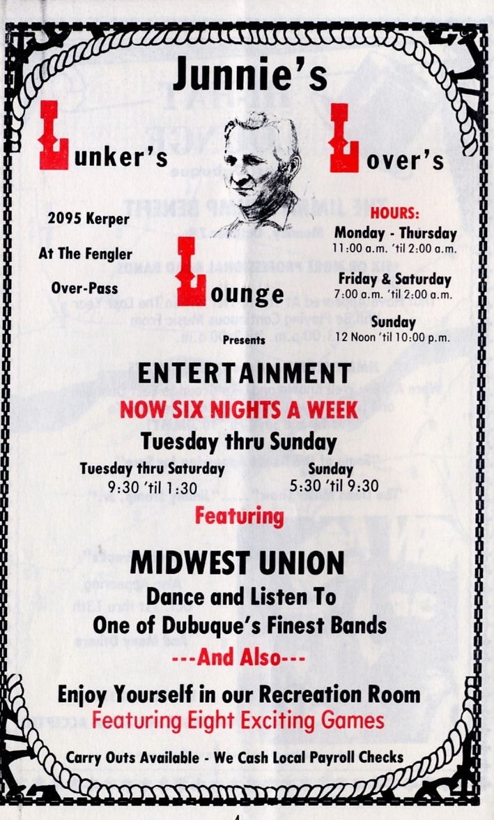 JUNNIE'S LUNKER'S LOVER'S LOUNGE. The 1977 through 1980 Dubuque City Directory listed 2095 Kerper.