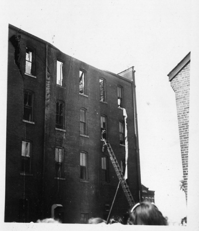 The only stream kept in operation was used to wet down the fire escape which people were trying to use and couldn't , due to the flames. One man was dying on the second floor landing off the escape, and another was trapped on the third floor. This man jumped into the net. As fast as they jumped we would dump them onto the ground and raise it for another. Sometimes we had to move the net to catch the falling body as much as five feet.