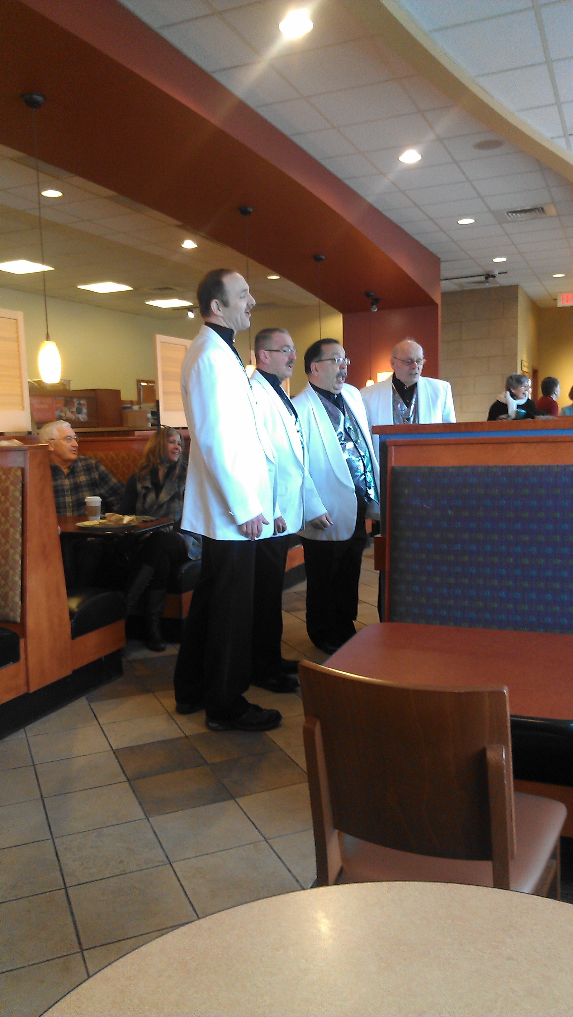 In 2010 the Chorus led a group of carolers organized by the Mercy Health Foundation from the HOTEL JULIEN DUBUQUE through area restaurants and finally to CABLE CAR SQUARE. One of the most popular seasonal successes has been the "Singing Valentines" held annually on Valentine's Day. Arriving unannounced at a home or place of business with rose in hand, a quartet will serenade a loved one. Members travel throughout the Dubuque area for the popular event. Each year the chorus goes around the Dubuque area singing Christmas carols.