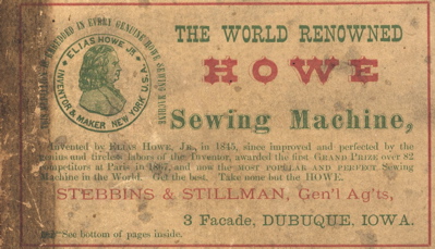 STEBBINS & STILLMAN. The 1870-1871 Dubuque City Directory gave the address of this business representing the Howe Sewing Machines, as 3 Facade Building.